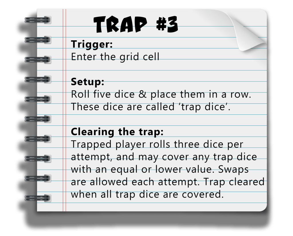 Clearing trap: Remove any die from tower except top die without toppling tower. Two attempts per turn.