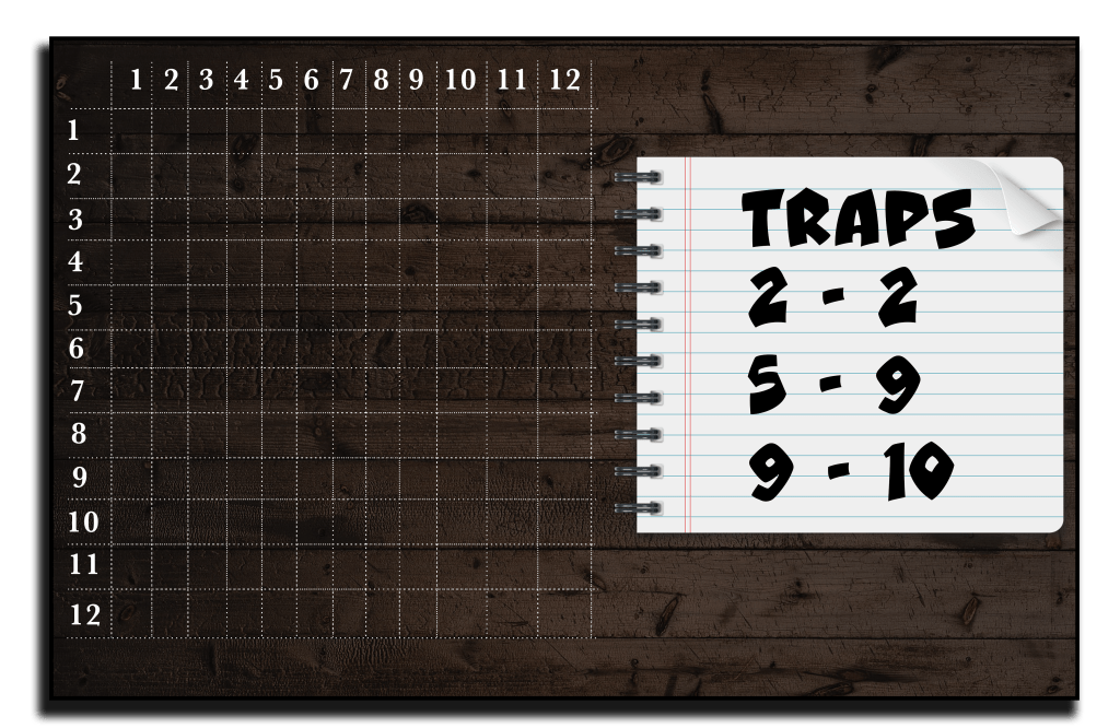 We’ll read rows, then columns when referencing these, and we’re picking 12 so that two 6-sided dice can reference them in a solo game. In this example, a player has chosen three locations for hidden traps during setup, prior to gameplay. The locations are written down and concealed so no one can change their minds later.