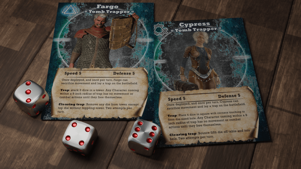 Anyway, one comment we’ve gotten from folks is they want more options in traps and flexibility in using Tomb Trappers on the tabletop. The cards come with default traps designed to be tough without being impossible and easy to set up & execute using only a small number of dice. This is simulating a situation where the trapped character card is locked down in place and struggling to free themselves. With some skill and/or luck, they just might do that!