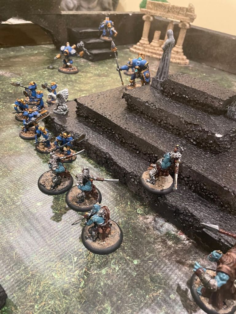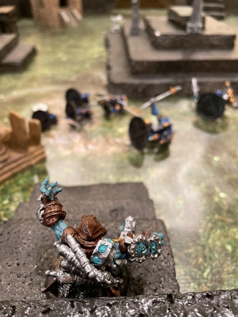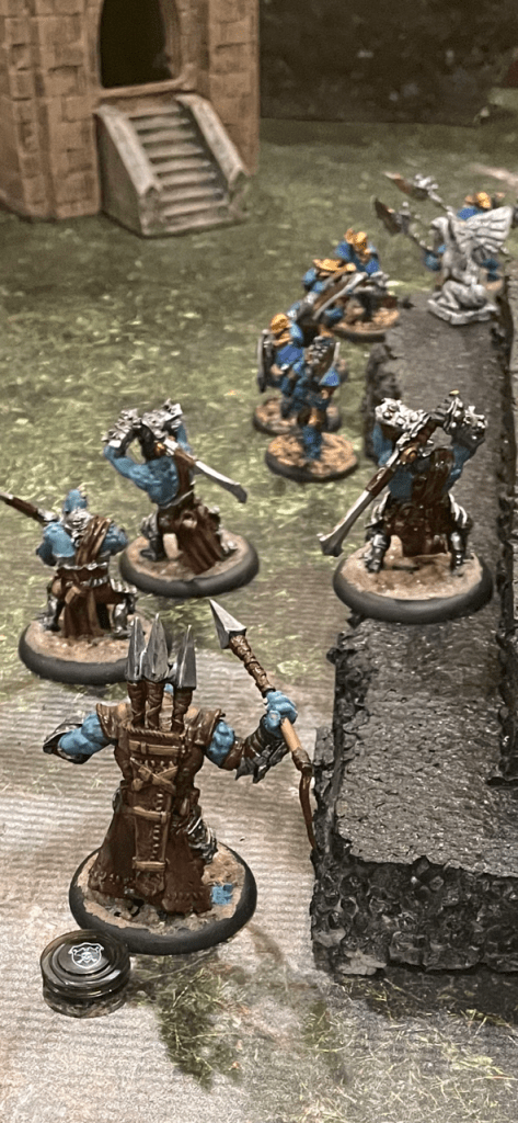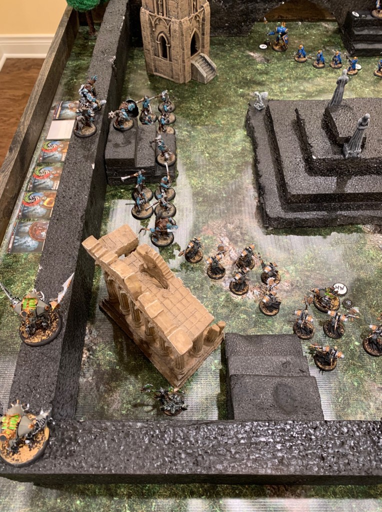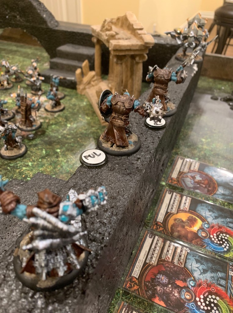 The Bane Witch herself (on the ground just to the left of the stairs in the lower part of the image below) snuck behind a set of ruins to take potshots at any enemies on the wall. That’s her two beastly warjacks, Slayer and Ripper in the lower left of the image on the wall, charging towards Ragnor Skysplitter, also on the wall and at the top of his own set of stairs. Her idea was for those two to get to Ragnor and hurt him, then sneak into range from the ground and cast her malicious spells for the kill. Typical for a bane witch.