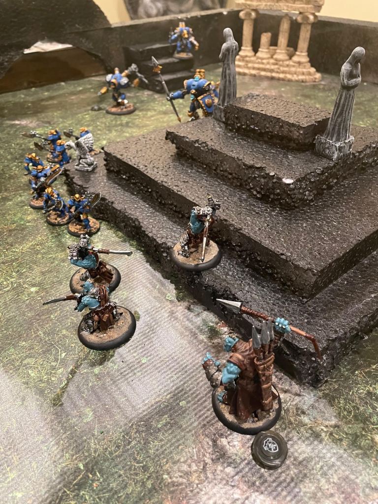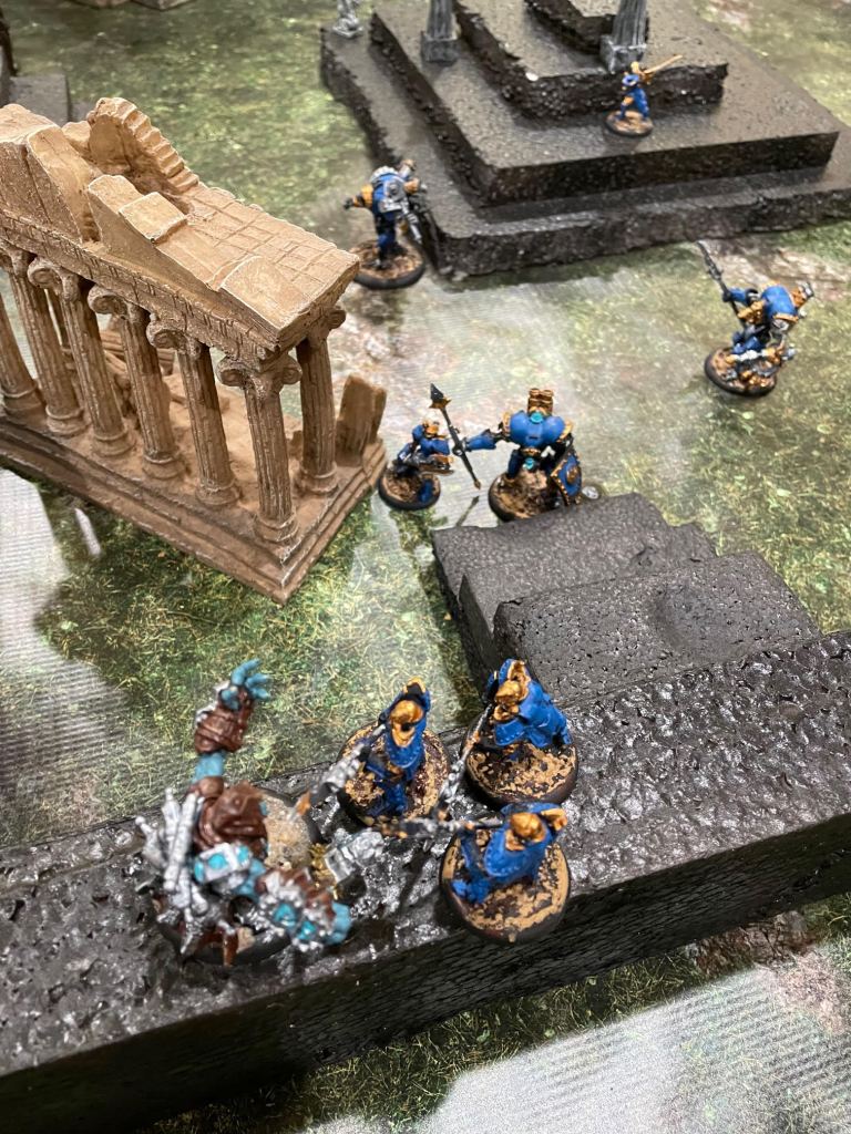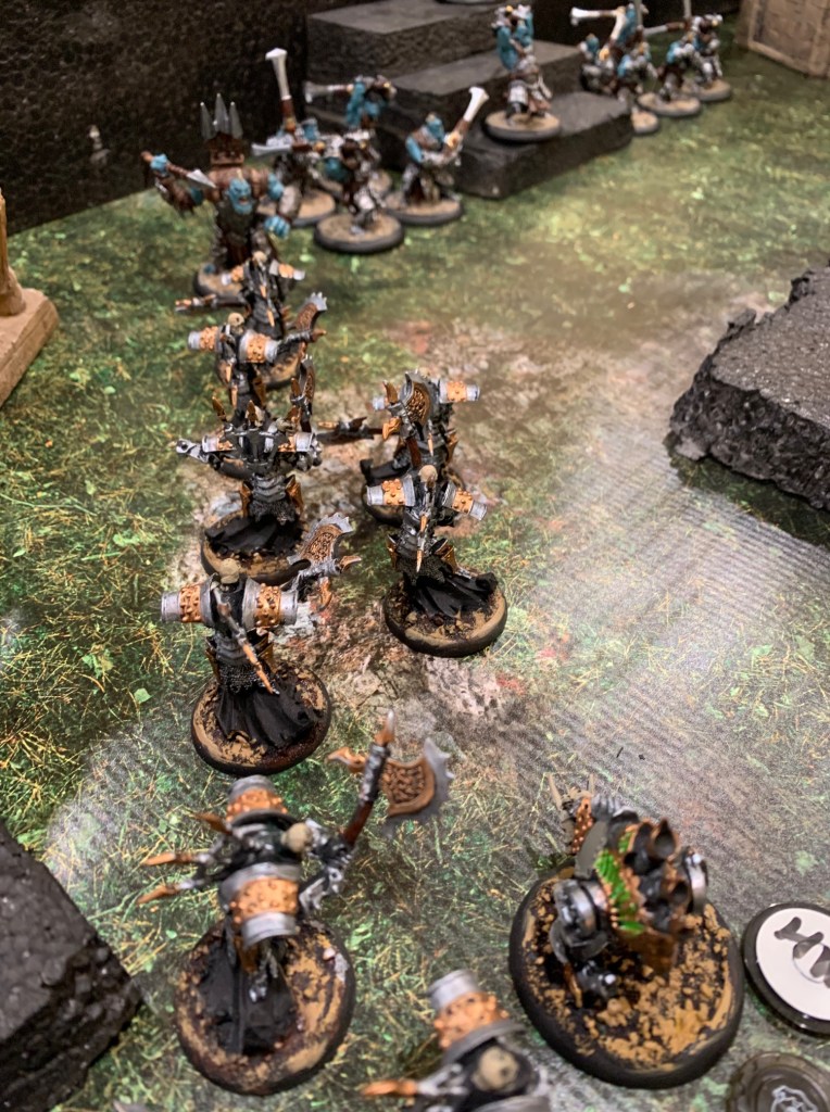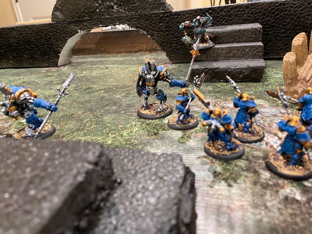 The Bane Witch herself (on the ground just to the left of the stairs in the lower part of the image below) snuck behind a set of ruins to take potshots at any enemies on the wall. That’s her two beastly warjacks, Slayer and Ripper in the lower left of the image on the wall, charging towards Ragnor Skysplitter, also on the wall and at the top of his own set of stairs. Her idea was for those two to get to Ragnor and hurt him, then sneak into range from the ground and cast her malicious spells for the kill. Typical for a bane witch.