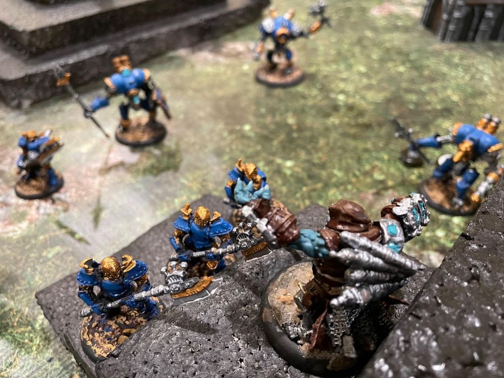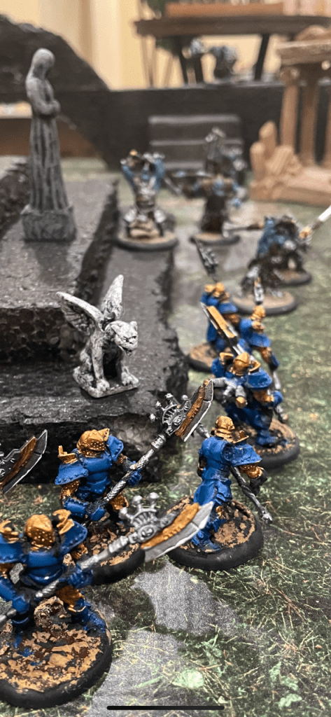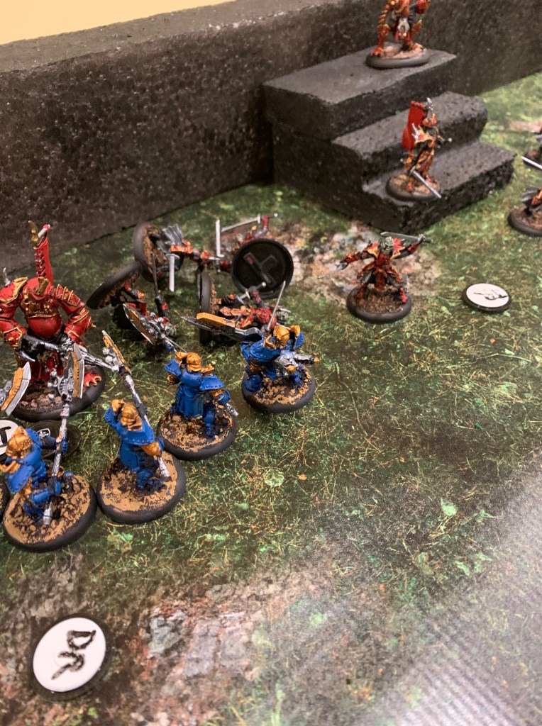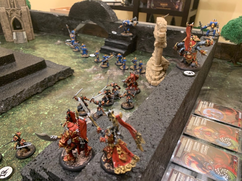 That particular clash was a fun one. Zaadesh had the idea that his rhino-beast (Titan Gladiator) would bash his guy out of the way, then jump off the wall (because he’s terribly slow) and charge into Major Beth from behind. It seemed more and more necessary to do something desperate as Maddox’s blue infantry wiped Skorne’s red army off the table. The damage the Titan would take in the fall though, and that he took in this fight, caused Zaadesh a bit of worry about the plan. He held off for months on that one, as COVID wore on…