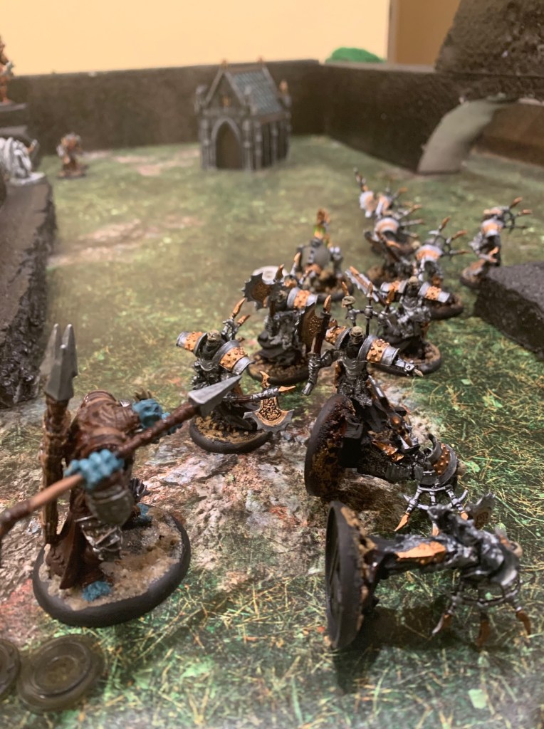 Ragnor sent his own leather-clad warbeasts along the wall to protect himself and stay in a strategic position to cast spells at Major Beth’s troops should they get that far before he did away with the Bane Witch.