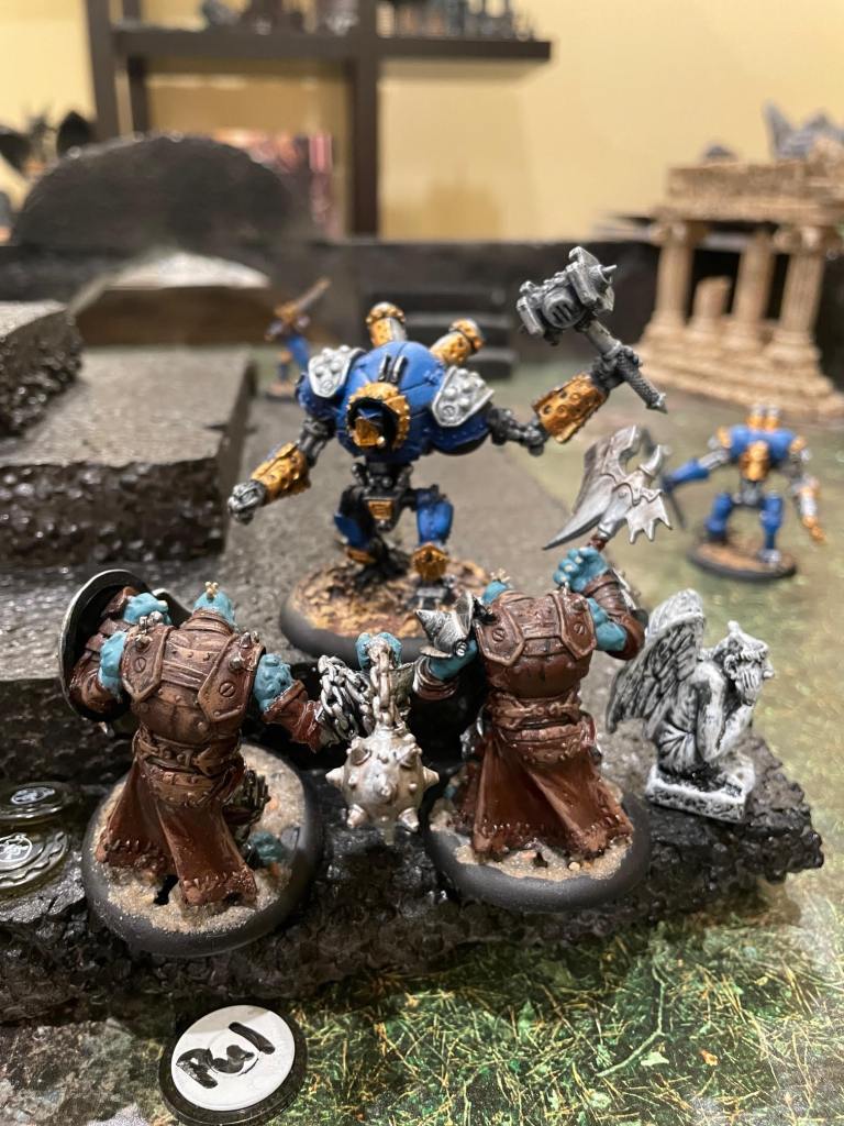 Major Beth stayed safely out of range while her hammer-wielder, Ironclad faced two trolls alone. Her two other warjacks ganged up on the spearthrower troll, Impaler.