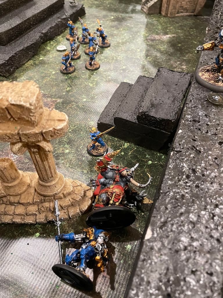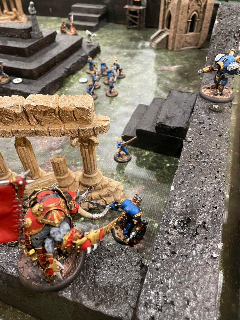 So after giving Firefly a beating, the red Titan picked him up and threw him off the wall, then jumped down onto him anyway. It was glorious. Zaadesh figured the jig was up anyway, as he lost more and more men. It was a gamble that didn’t really work, but felt amazing. (I tweaked the rules a bit on this, because I really, really wanted to throw someone off that wall!)