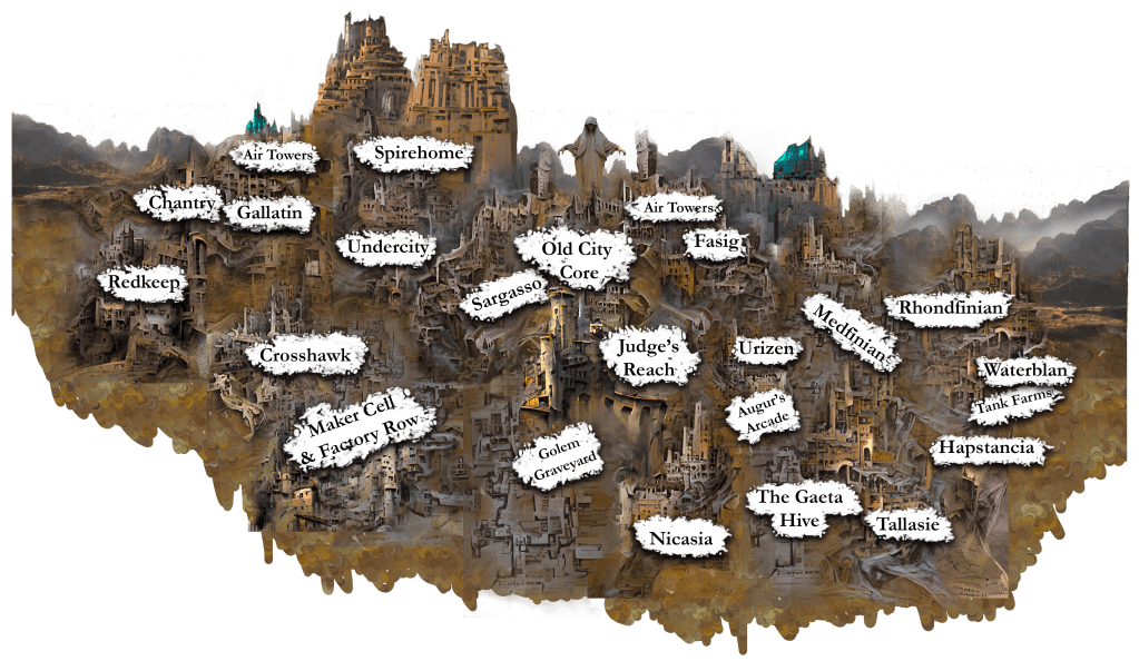 Towerlock: An abandoned oriel terminus has been discovered on the summit of a towering granite butte in the desert country in Jasphouse Province. A single oriel gateway leads to artificial pockets of space left over from The Infinite Republic, and could contain treasures and technologies beyond belief. Yet a terminus might contain as many as twenty such gates. No one nation can be allowed to control that sort of thing.