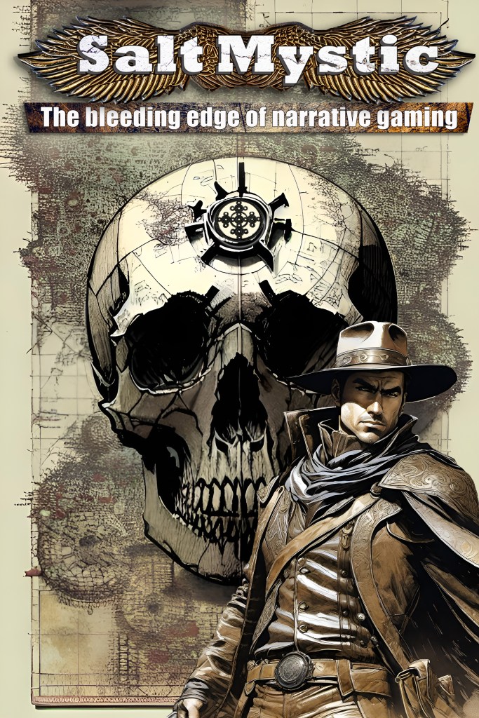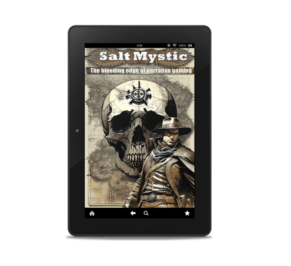 One thing we’ve heard loud and clear from you is that you feel it’s hard for someone to first get into the Salt Mystic universe without having the Sourcebook And Core Rules. You’ve got your battle deck, your own copy of the book, and you’re ready to smash some tornadoes together. Your head’s swimming with images of gunslingers dueling with ball lightning and abandoned sparkling oriel gateways leading to treasures and ruin.