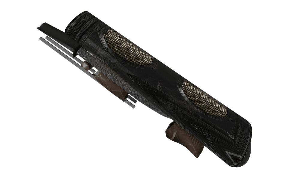 This is an example of what I’m talking about. The ball lightning carbine is a distinctive weapon, strapped to the arm of practically any adventurer in Grailrunner’s Salt Mystic universe. I made this thing in Blender with some parts from various models (a motorcycle, crutch, and I forget what all). The frame of it and the leather straps were just cylinders that I squashed and pulled into place, then added textures. Now I’ve got this thing in a hundred styles and orientations.