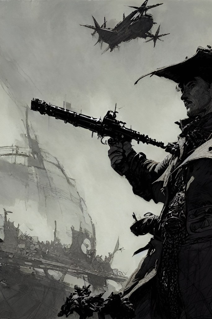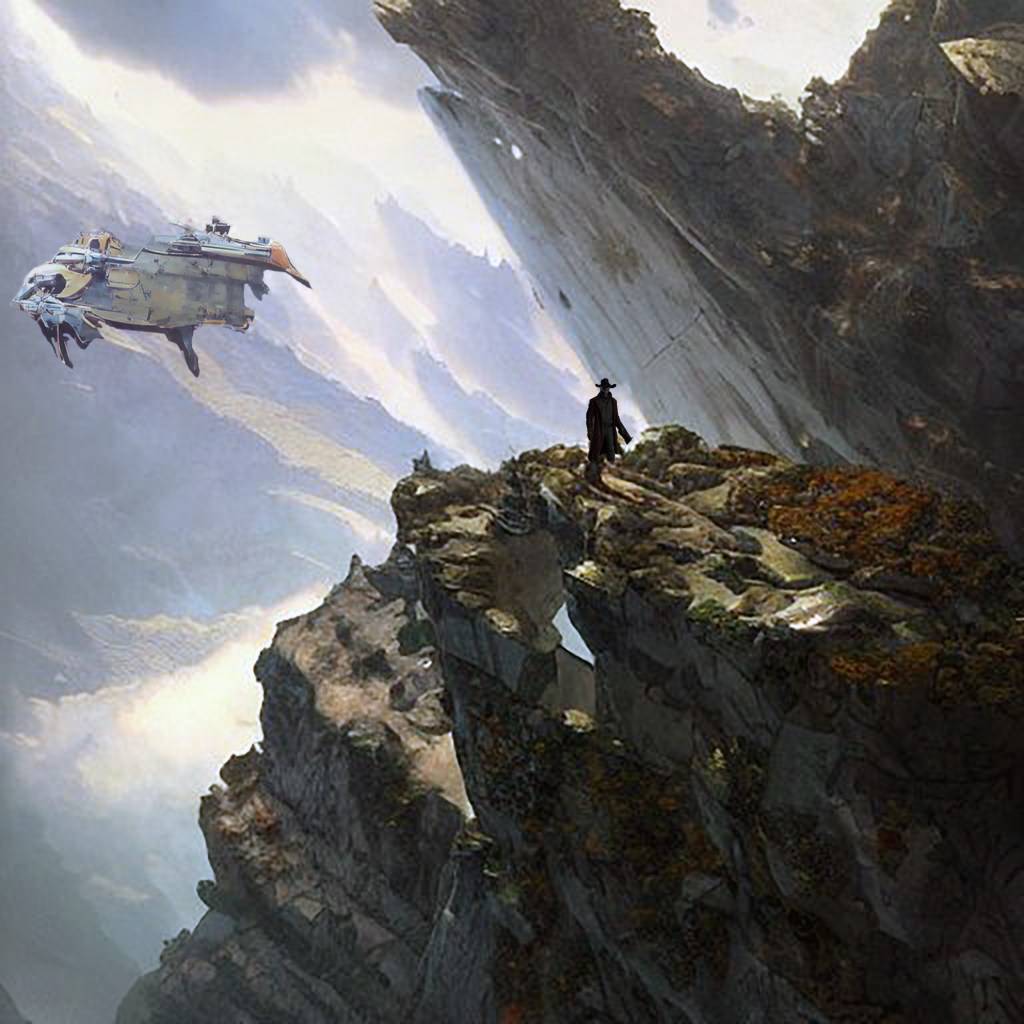 2. With Stable Diffusion, I experimented with a series of prompts suggesting the aerial view, the mountain top and valley, and the “fantasy gunslinger”. It took patience, not going to lie about that. And I cycled through several artists incorporated in the prompts to try different styles as well (you can mix artists too!).