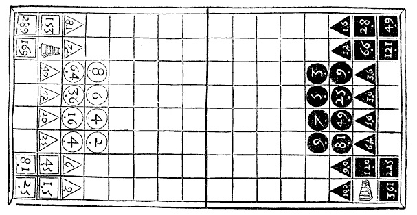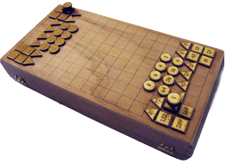 Game pieces: Game pieces are either circles, triangles, or squares, all with numbers on them. The two game piece sets aren’t the same, nor are they symmetrical, though the White player’s pieces are based on even numbers and Black’s pieces on odd numbers. The numbers themselves, their placement in the starting setup, and the movement rulesets are all based on Boethius’s proportions. Precisely defined stacks, one stack per opponent and called ‘pyramids’ are provided for as well.