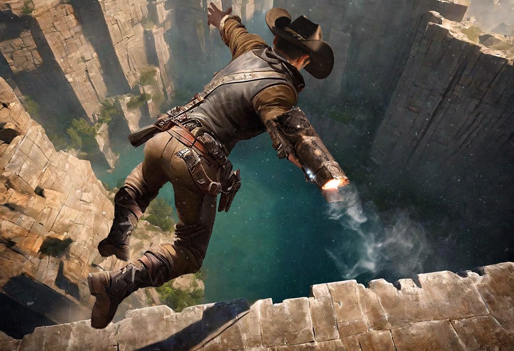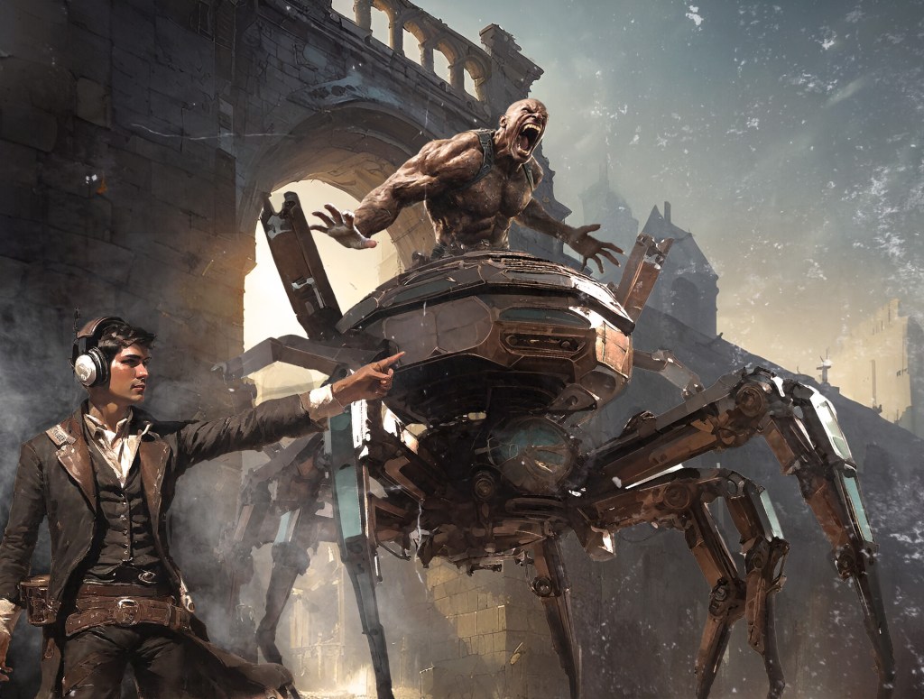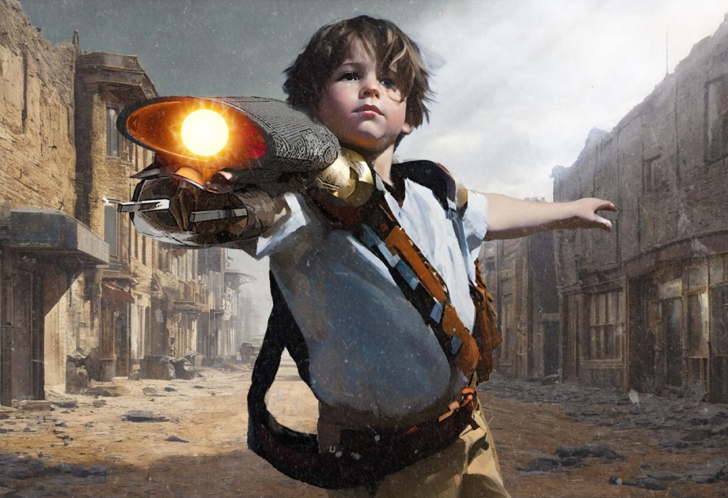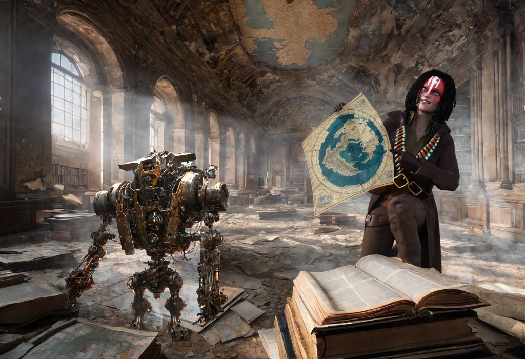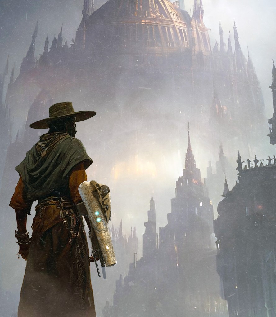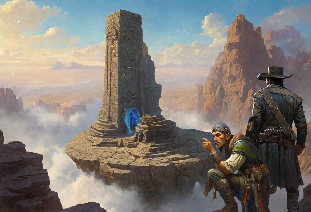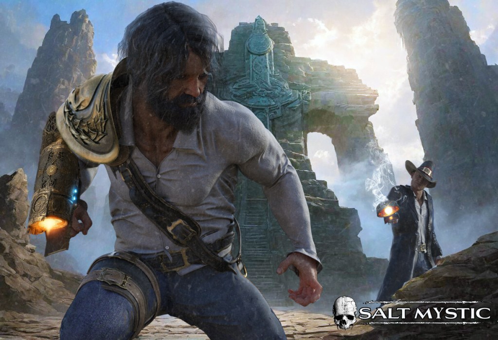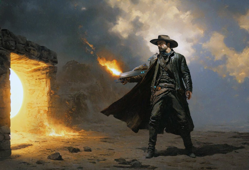 The images below represent the style of work I’m building these days, relying heavily on photobashing and concept art techniques (with folks like Imad Awan as my virtual gurus). The Grailrunner house design standard is semi-realistic digital painting with grungy overlay, western themed adventurers almost always carrying the signature weapon (a gauntlet-based plasma weapon that doubles as a shield in duels), exploring statue-riddled, software-haunted ruins with shimmering dimensional portals. We aim for vibrant or earthy colors, lots of smoke and grit, with implied stories (often illustrating flash fiction on Salt Mystic lore cards).
