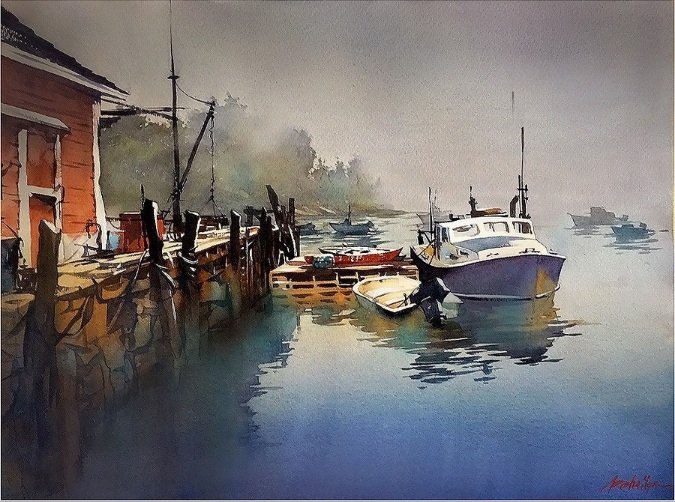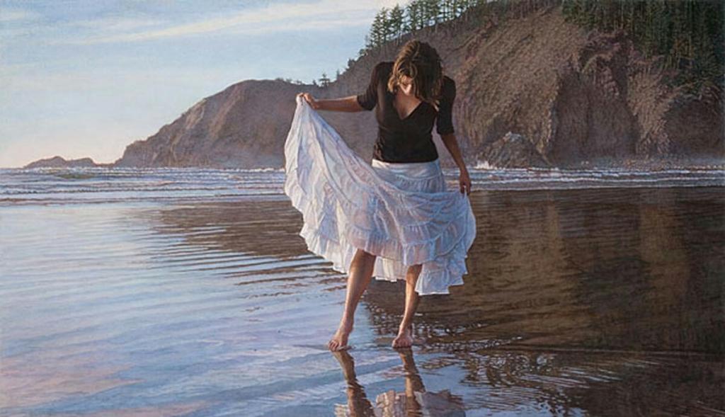 Watercolor pigment does what it feels like doing on the paper. It moves around. Crashes. Blossoms. Ignores your feeble mortal attempts to control it. But it makes incredible gradients and blooms and textures like nothing else. And its mightiest trick, almost its entire reason for being, is to capture light. I’m talking about the translucency of a green leaf in summer with sunlight bleeding through, the broken sunbeam dancing on a marble floor, the ghostly and serene reflections of clouds and seafoam on the beach once the wave goes out. Google “Steve Hanks” and Thomas Schaller to see what I mean.