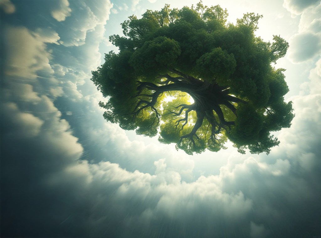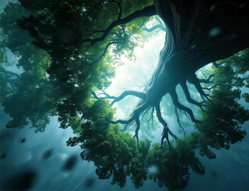 It takes no time at all before you’re having to hold on to knurls and warps in the trunk to avoid drifting into the sky. High above you, people are swimming in a raindrop as big as a sky scraper. It’s a lake, pulled into an elongated sphere by surface tension. And they’re swimming inside!