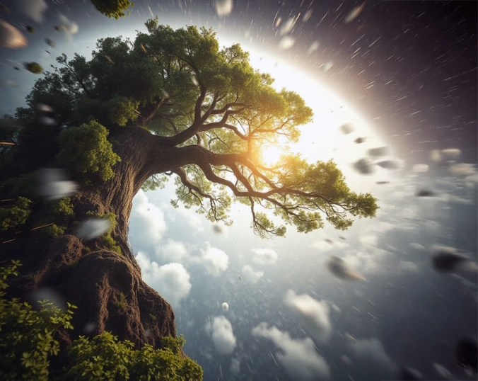 Indeed, the tree is bigger than you imagined, stretching into the distance above you as far as you can see, with a yellow sun way up there making a halo around its fuzzy far end. You squint and can just make out against the glare that the massive tree is bare along the bulk of its trunk above your canopy here though it appears to have a similar clump of foliage on the opposite side of the trunk from yours though that’s just a thin hair-like black silhouette to you this far away. The entire tree is shaped like a planetoid-sized elongated “S” with you clinging to the bottom left-hand curve of it. Your tree limb juts off the main trunk, though it’s so large a hundred others like you could just live here.