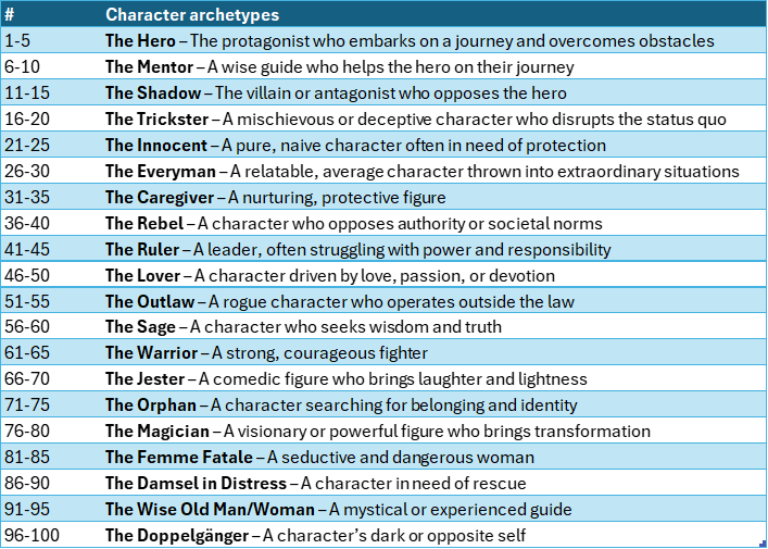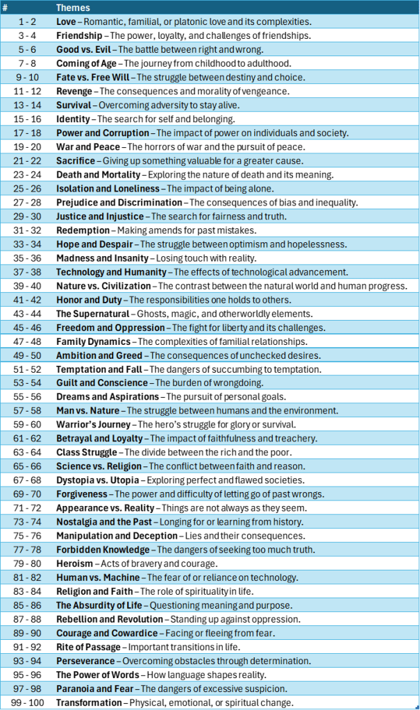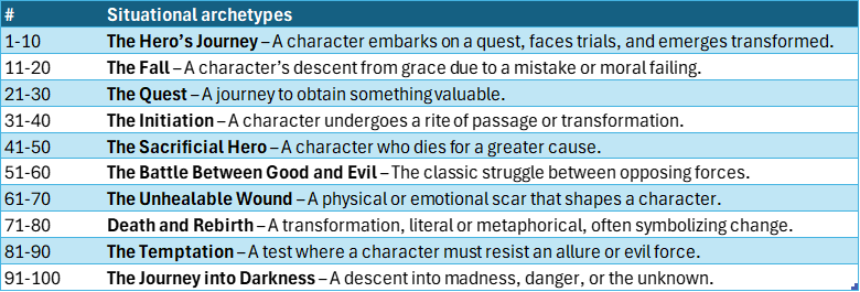 Here are the commonly accepted themes of mythology and folklore in a table, arranged into numbered entries appropriate for a roll of D100 dice:
