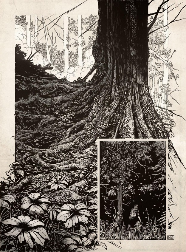 5. Awesome. Simply awesome. Why traditional pen & ink? I’ve got to say, when you mentioned 19th century master, Franklin Booth in a previous interview, I got incredibly excited. The guy was on a different level of genius! You also cited Gustave Dore, Bernie Wrightson, and Joseph Clement Coll. What is it about that kind of art that attracts you?