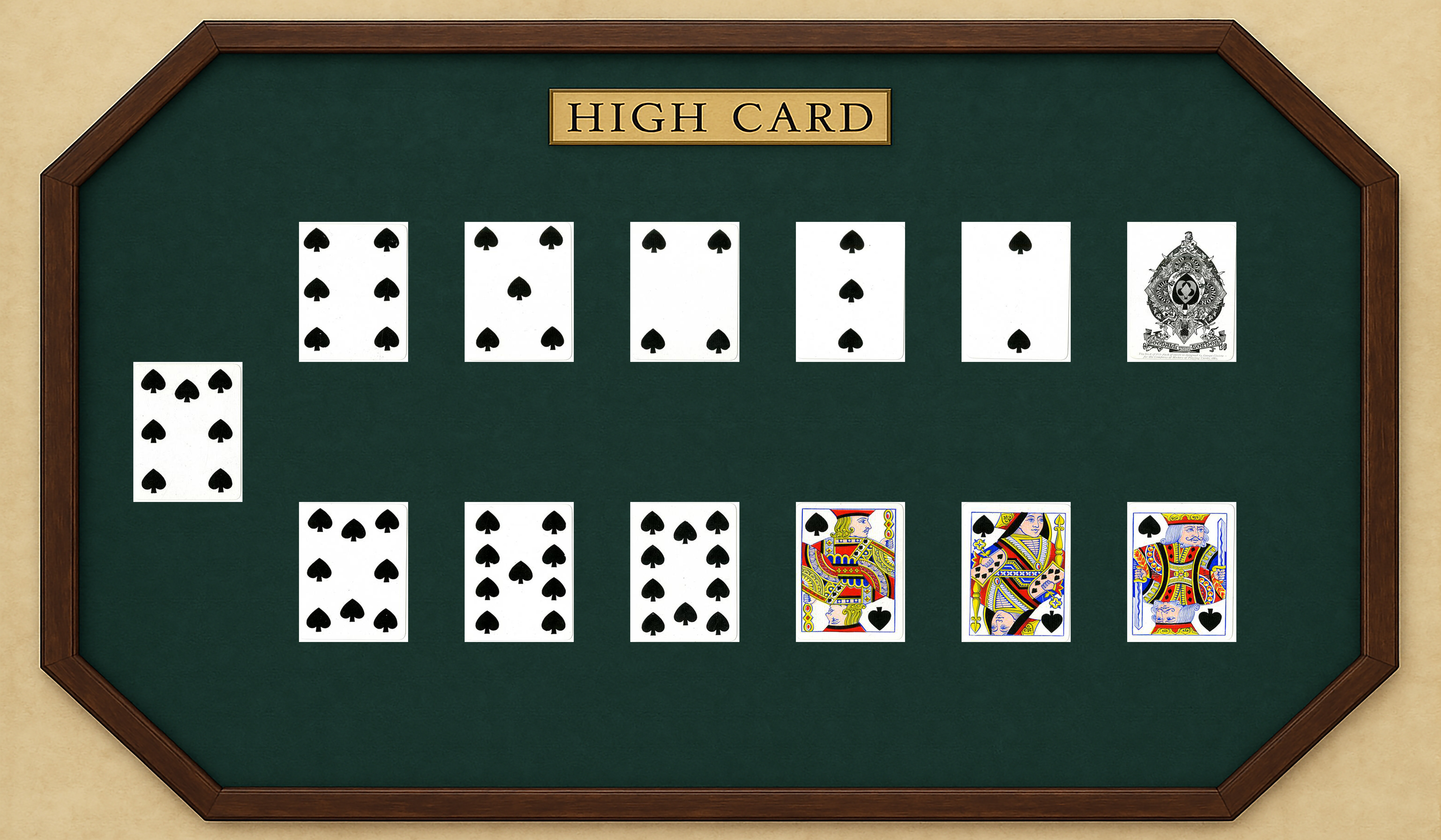 One dealer, multiple players. Standard 52 card deck with no Jokers. Before them on the table is a spread of cards on which they’ll place their bets representing one each of a suit (so Ace is 1, then 2-10 and the face cards). The particular suit on the table doesn’t matter – just what kind of card it is. This layout is just a spot for players to put their chips as they bet on which cards the dealer will draw next each round.