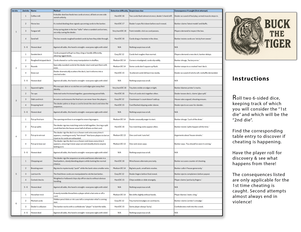 Trumble’s extensive descriptions of cheating methods made me wonder if this wouldn’t be a lot of fun in a roleplaying campaign – something quick to drop in to a wild west scenario in the ruleset or storyline of your choice where players could actually play the card game, gamble authentically, and be cheated. The game master could drop clues that cheating was happening, and dice rolls could decide how obvious that is and which authentic cheating methods were occurring.