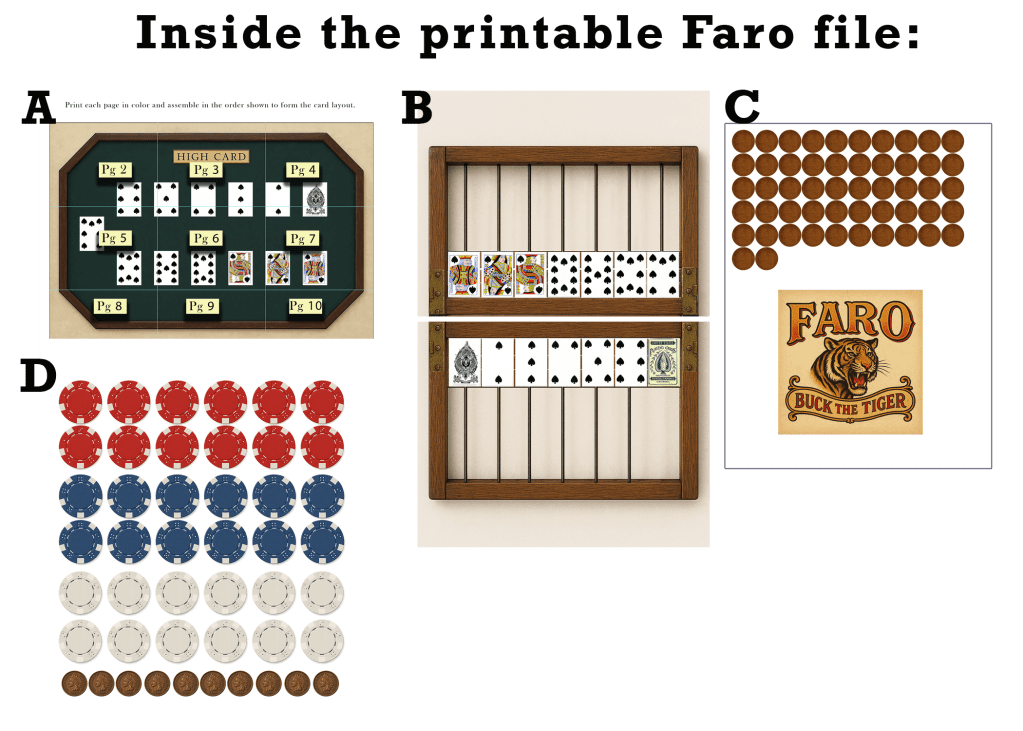 - A: The Faro card layout itself in several pages for accuracy on size – print and place per the instructions.