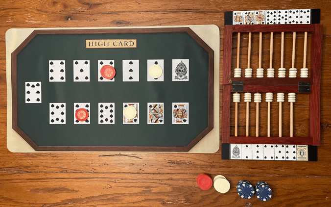 That abacus device was called a “case keeper”. You slide the beads to keep track of what cards have been drawn so players can know better what’s left in the deck to be drawn. It makes the game much more exciting towards the last few hands as you have better information.