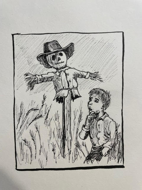 “You have achieved a fine effort in line drawing, and there is evident care in your composition and subject choice. The nostalgic theme—a young boy in thoughtful contemplation before a scarecrow—is charming and well-suited to ink. Now, let us refine your rendering through a few key observations and recommendations: