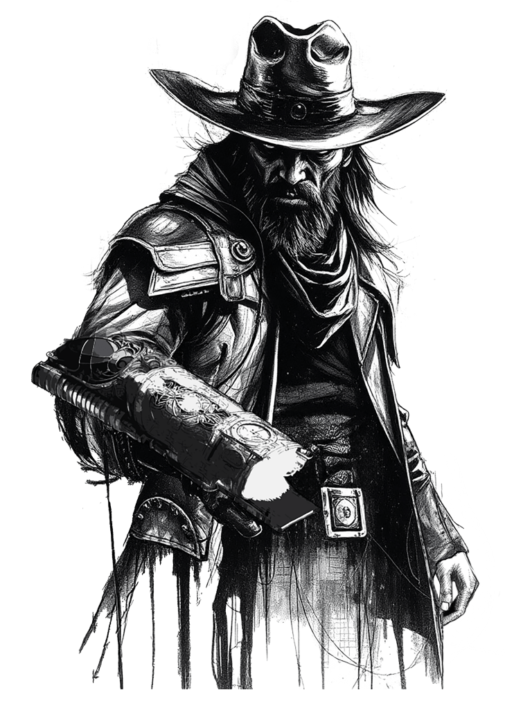 That’s interior art for SALT MYSTIC: BOOK OF LOTS. I did it, but I cheated. The base gunslinger was a couple of AI-generated pieces, drained of color and mashed together, cleaned up a bit, and mashed into an original 3D render of the plasma weapon on his forearm. I composited all that into the one image for a splash page as you first open the book.