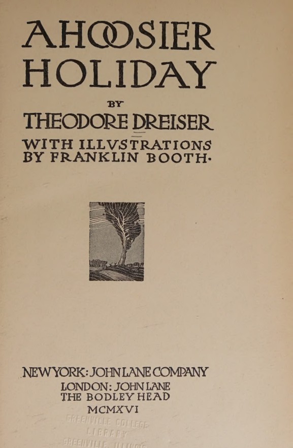 And here’s a real gemstone that I found which took on an entirely different function than its author intended: a 1916 travelogue written by Theodore Dreiser where he went on a road trip with Booth himself! It’s called A Hoosier Holiday, available by smashing the title page button below: