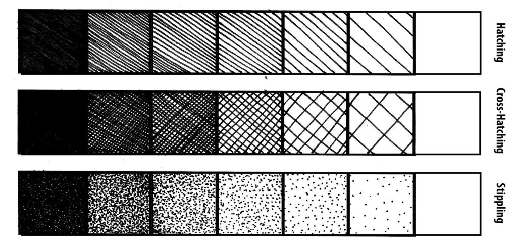 I’d ask you to keep in mind that the pen & ink artist has exactly one way to generate values and shadows, and that’s with black marks. Usually, lines. If they want shades of gray, they draw lines.